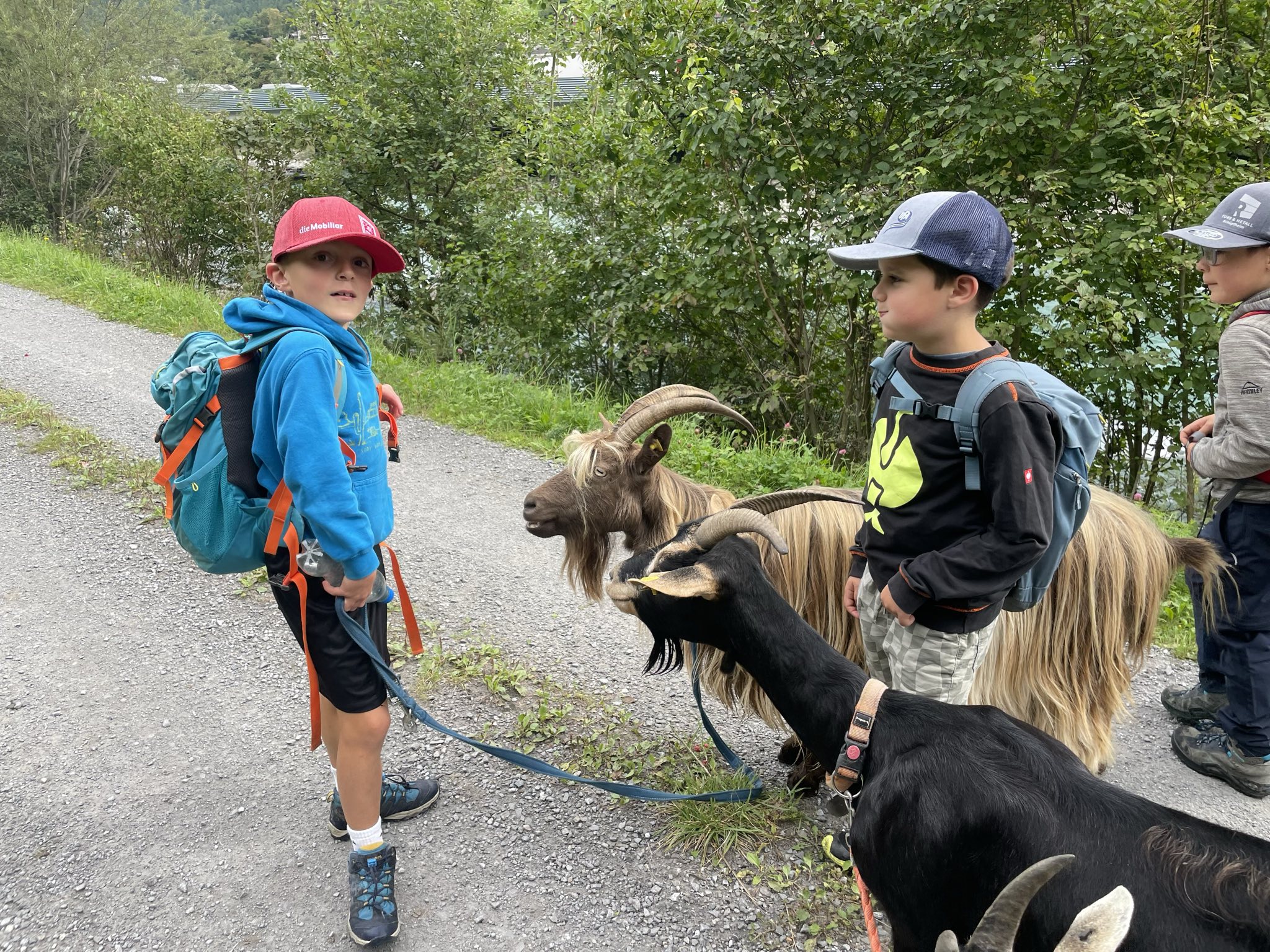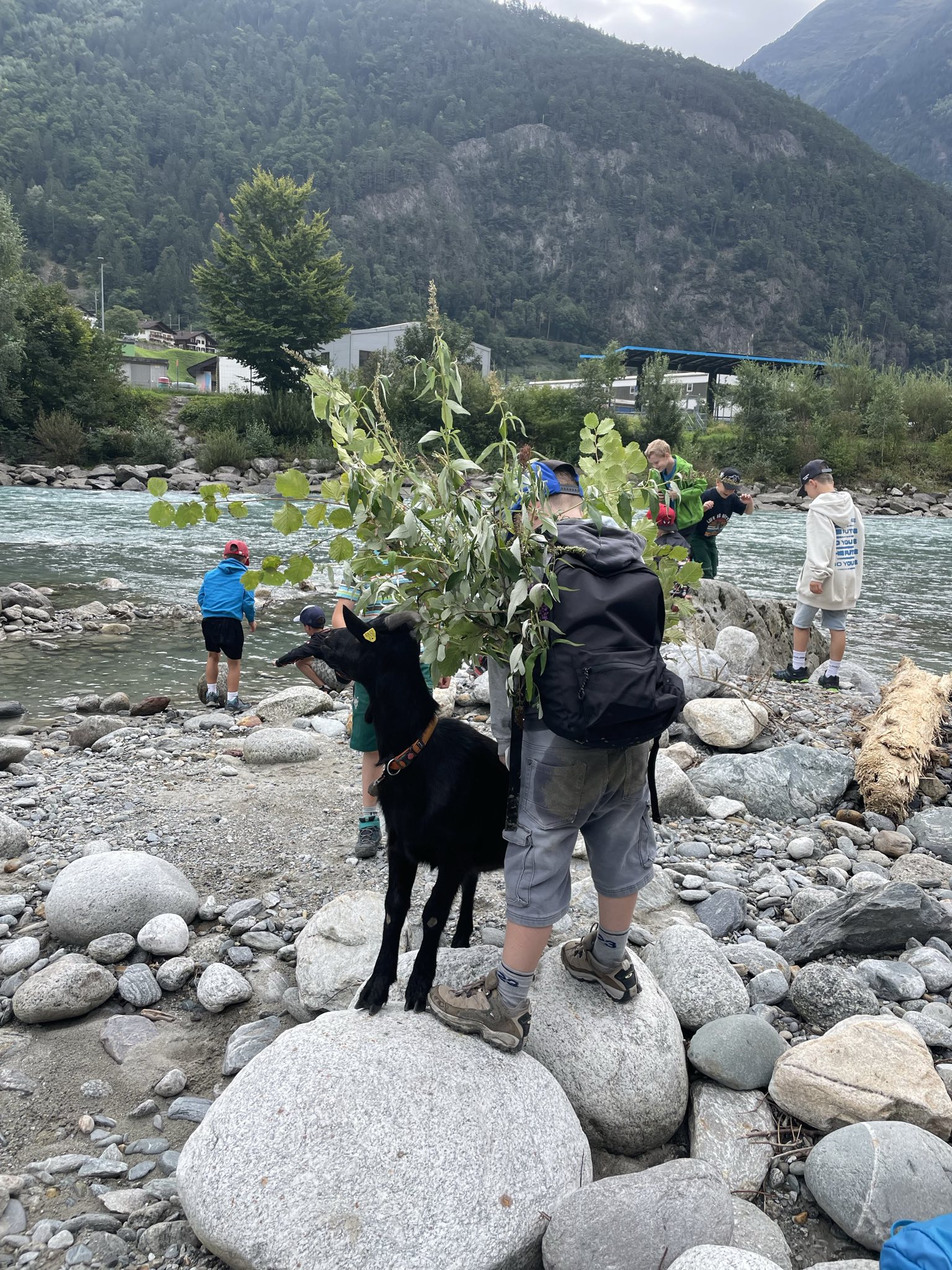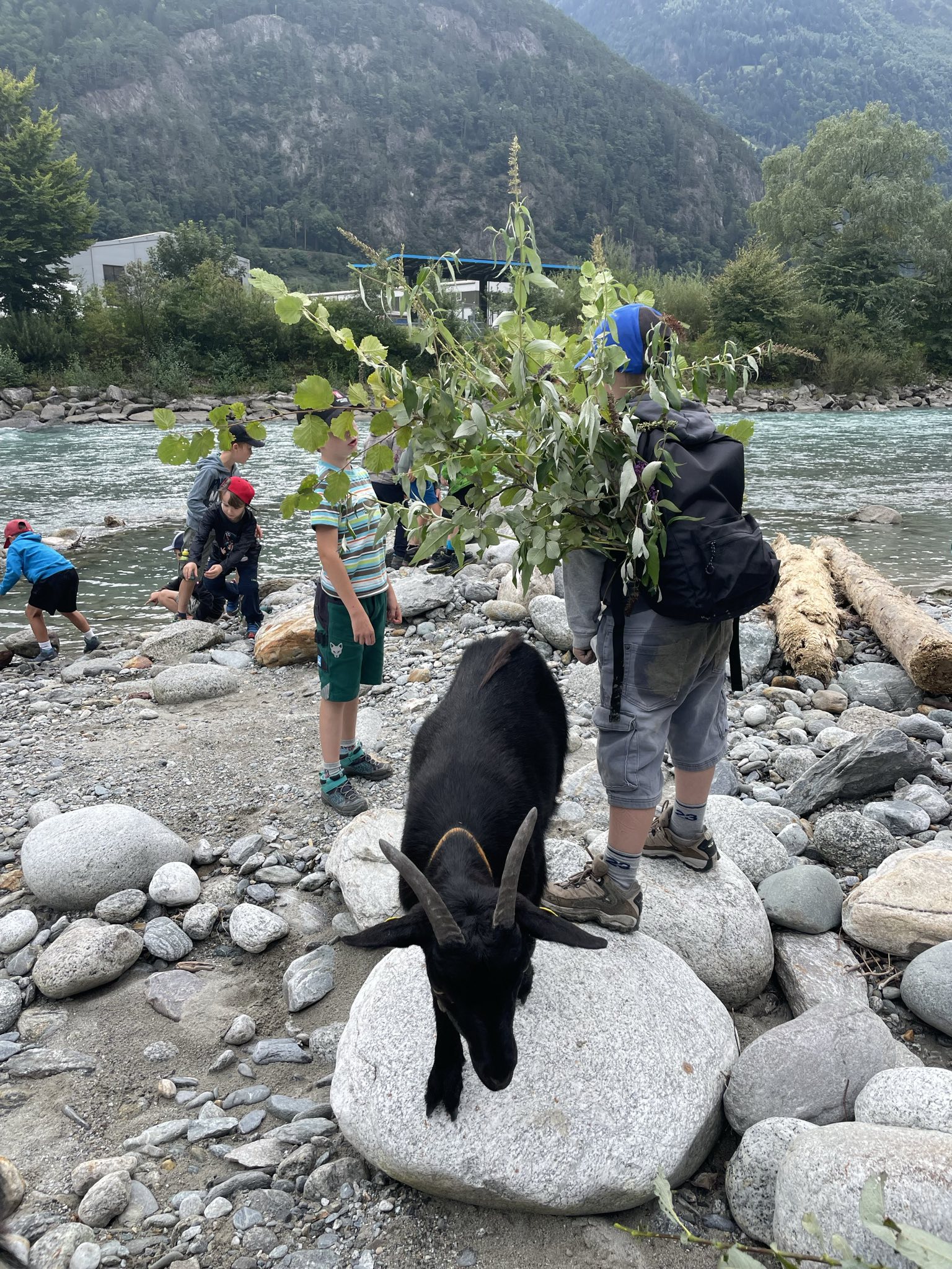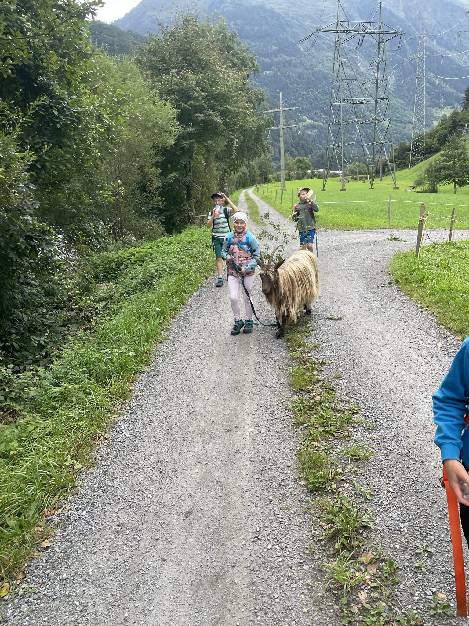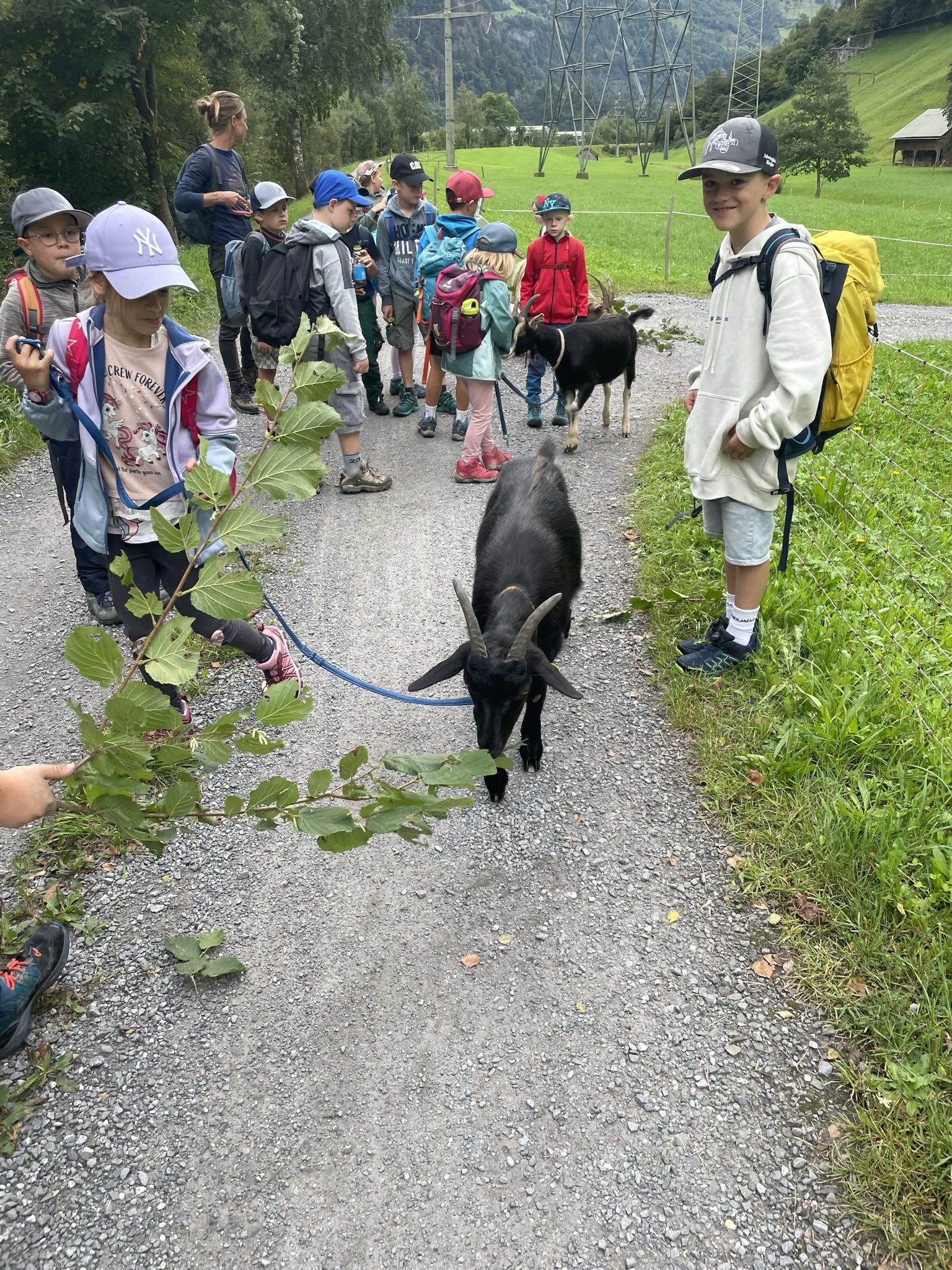 Mit dem Bus fuhren wir zuerst nach Amsteg. Dort warteten beim Bähndli Amsteg-Arnisee bereits 4 hungrige Ziegen und ihre Besitzerin Nadine Bless auf uns. Die Ziegen waren sehr zutraulich und liefen mit uns frei der Reuss entlang Richtung Selderboden (Silenen). Auf der Strecke durften wir die Ziegen Elma, Rocky, Carina und Blacky mit Blättern und Blumen füttern und sie für eine kurze Zeit sogar an Leinen führen. Nach dem Zmittag auf dem Selberboden mussten wir uns auch schon wieder von den Ziegen und Nadine verabschieden. Die restliche Zeit vor der Rückfahrt verbrachten wir auf dem Spielplatz.