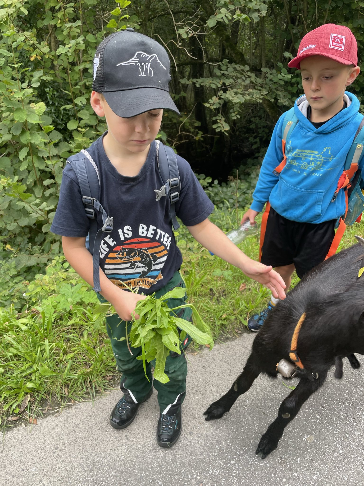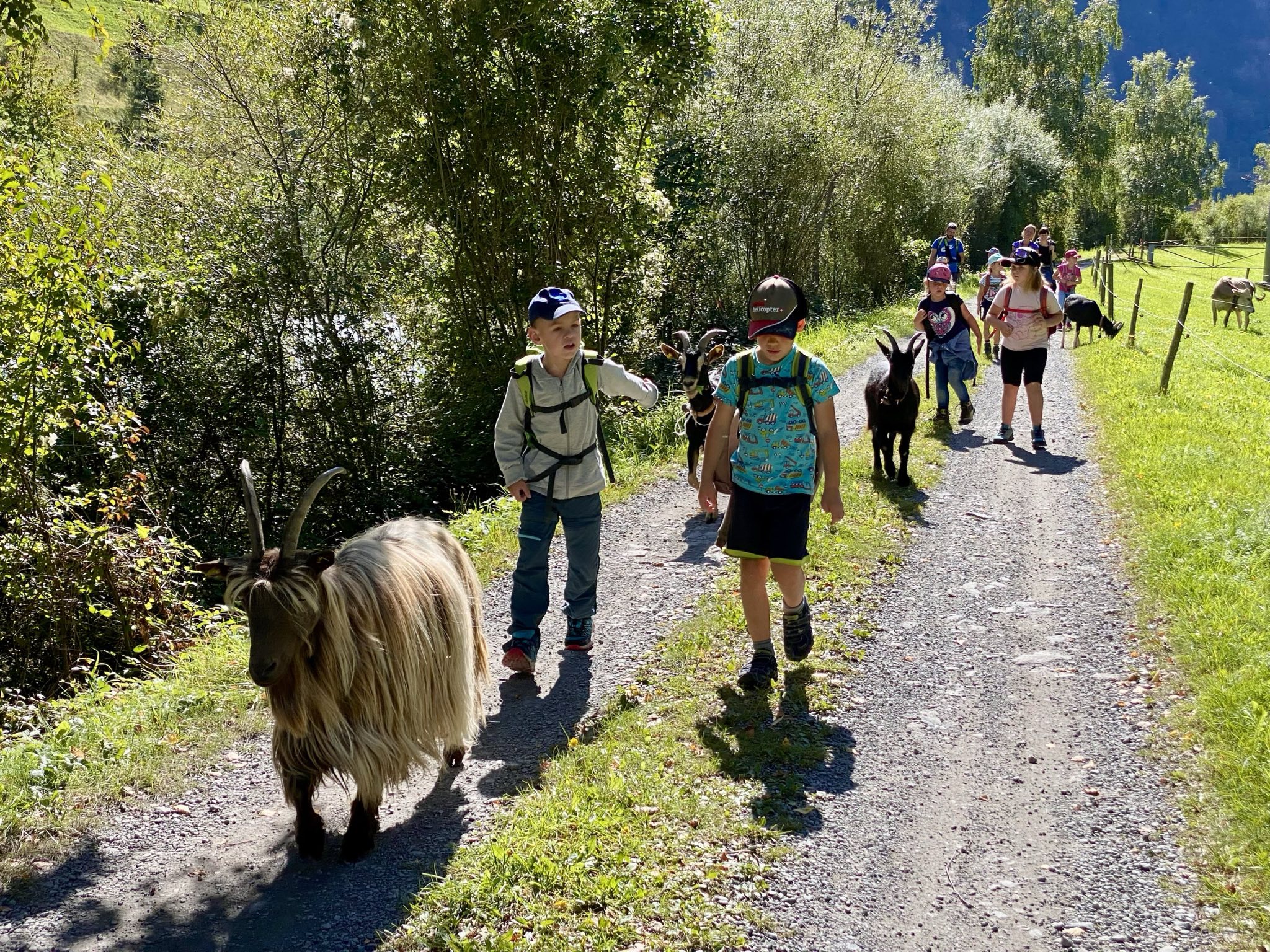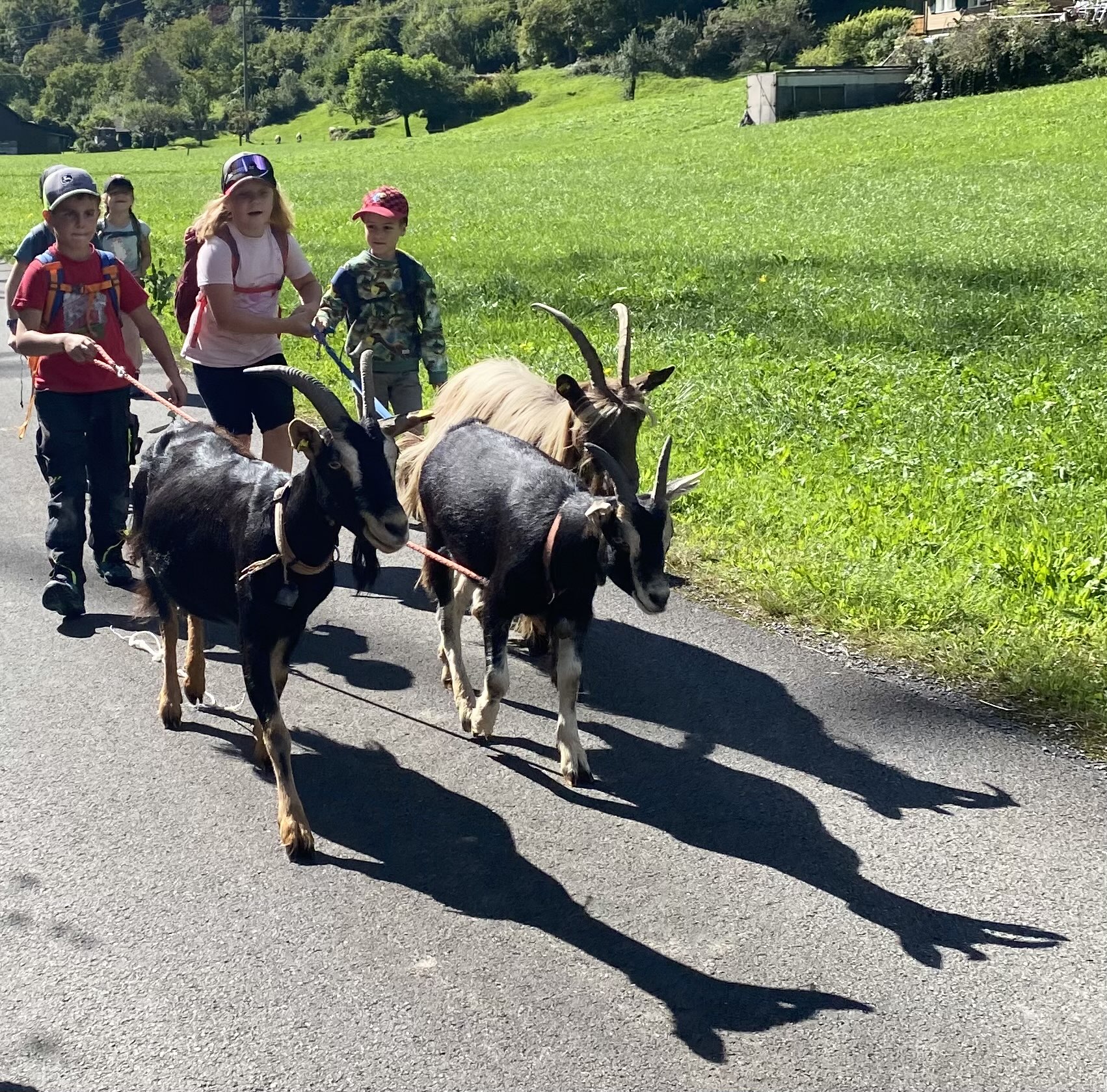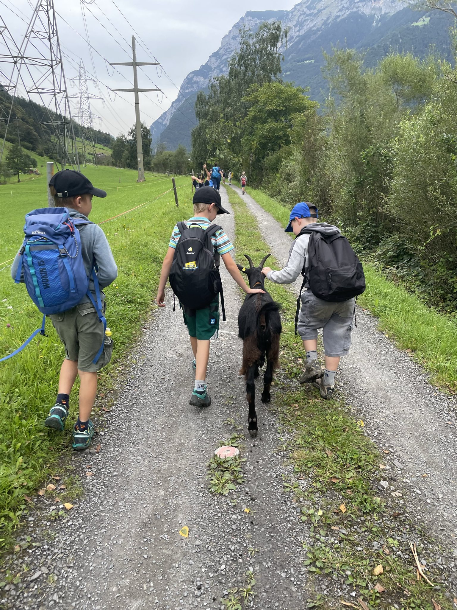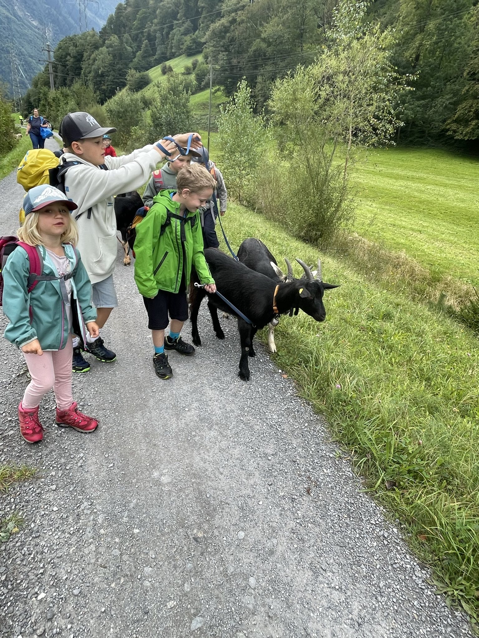 Mit dem Bus fuhren wir zuerst nach Amsteg. Dort warteten beim Bähndli Amsteg-Arnisee bereits 4 hungrige Ziegen und ihre Besitzerin Nadine Bless auf uns. Die Ziegen waren sehr zutraulich und liefen mit uns frei der Reuss entlang Richtung Selderboden (Silenen). Auf der Strecke durften wir die Ziegen Elma, Rocky, Carina und Blacky mit Blättern und Blumen füttern und sie für eine kurze Zeit sogar an Leinen führen. Nach dem Zmittag auf dem Selberboden mussten wir uns auch schon wieder von den Ziegen und Nadine verabschieden. Die restliche Zeit vor der Rückfahrt verbrachten wir auf dem Spielplatz.