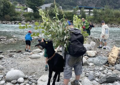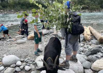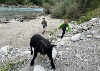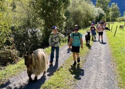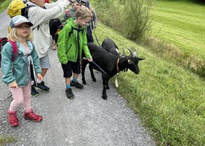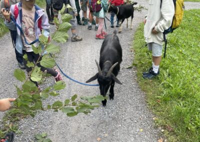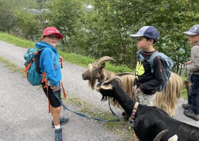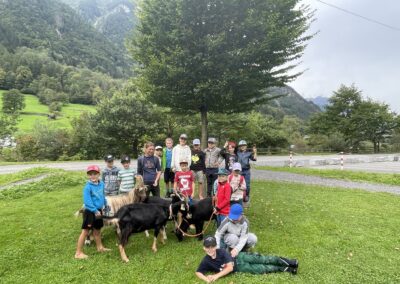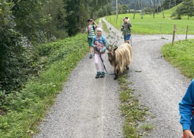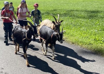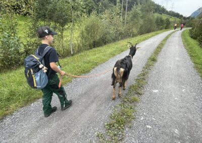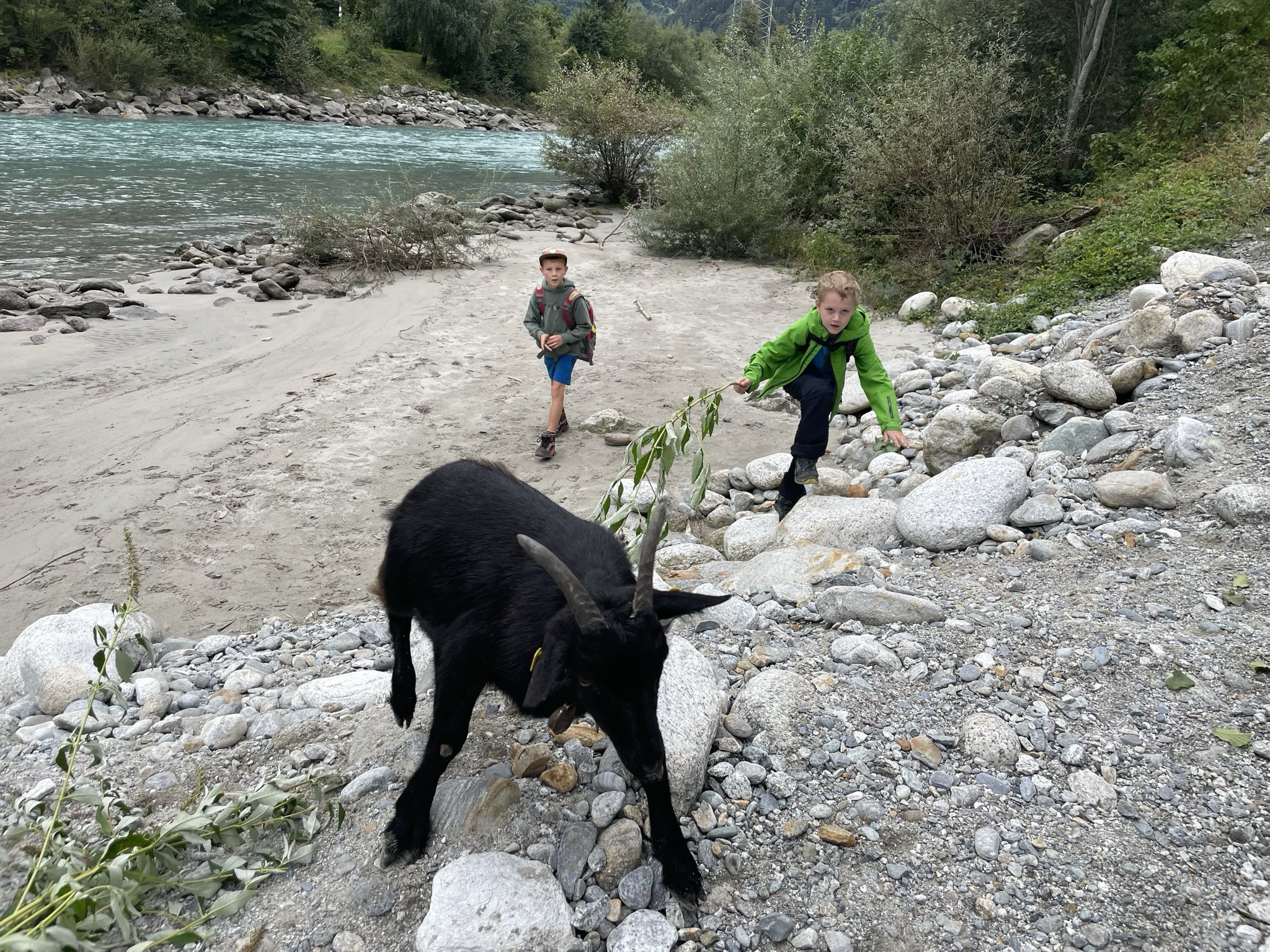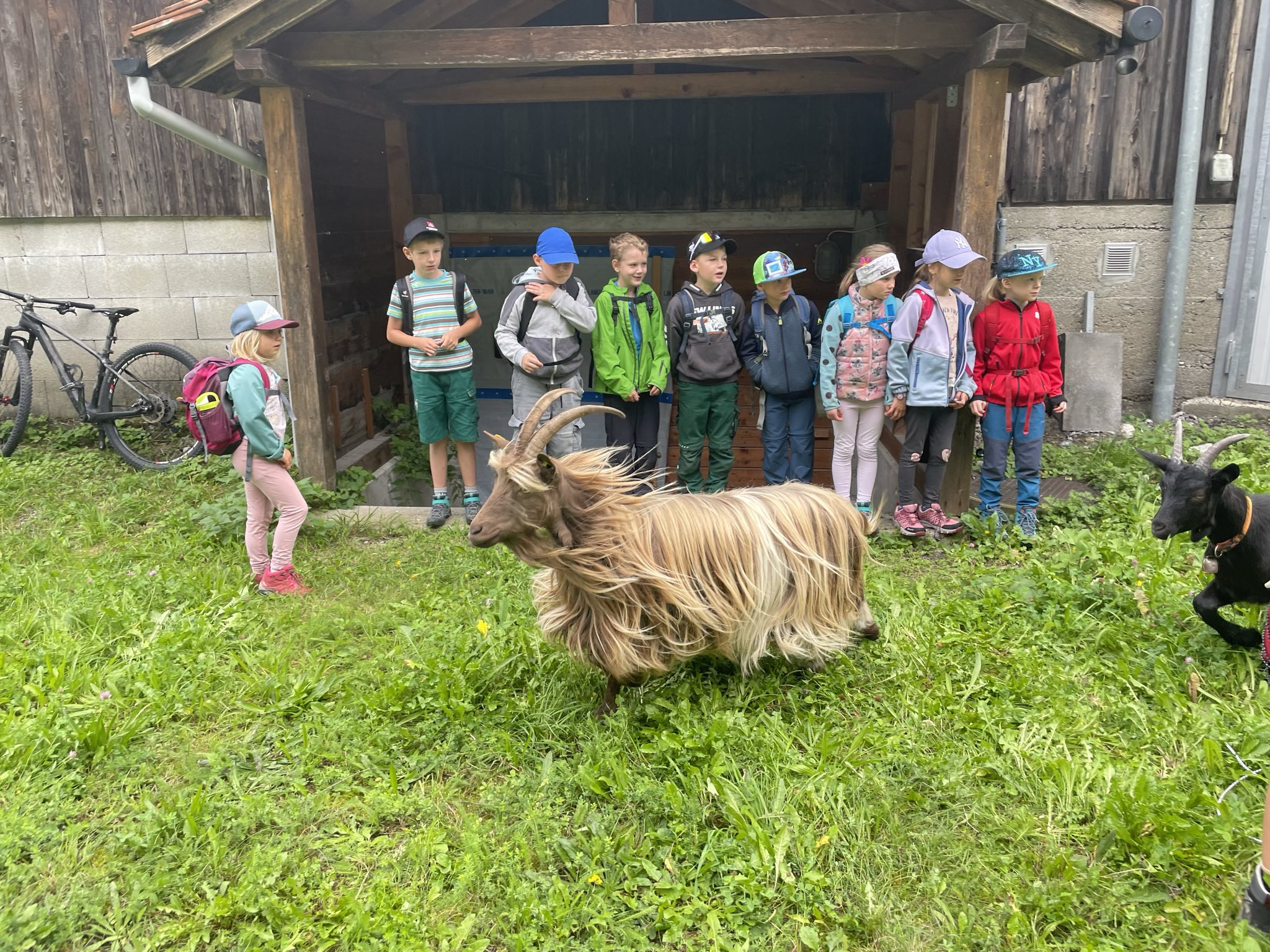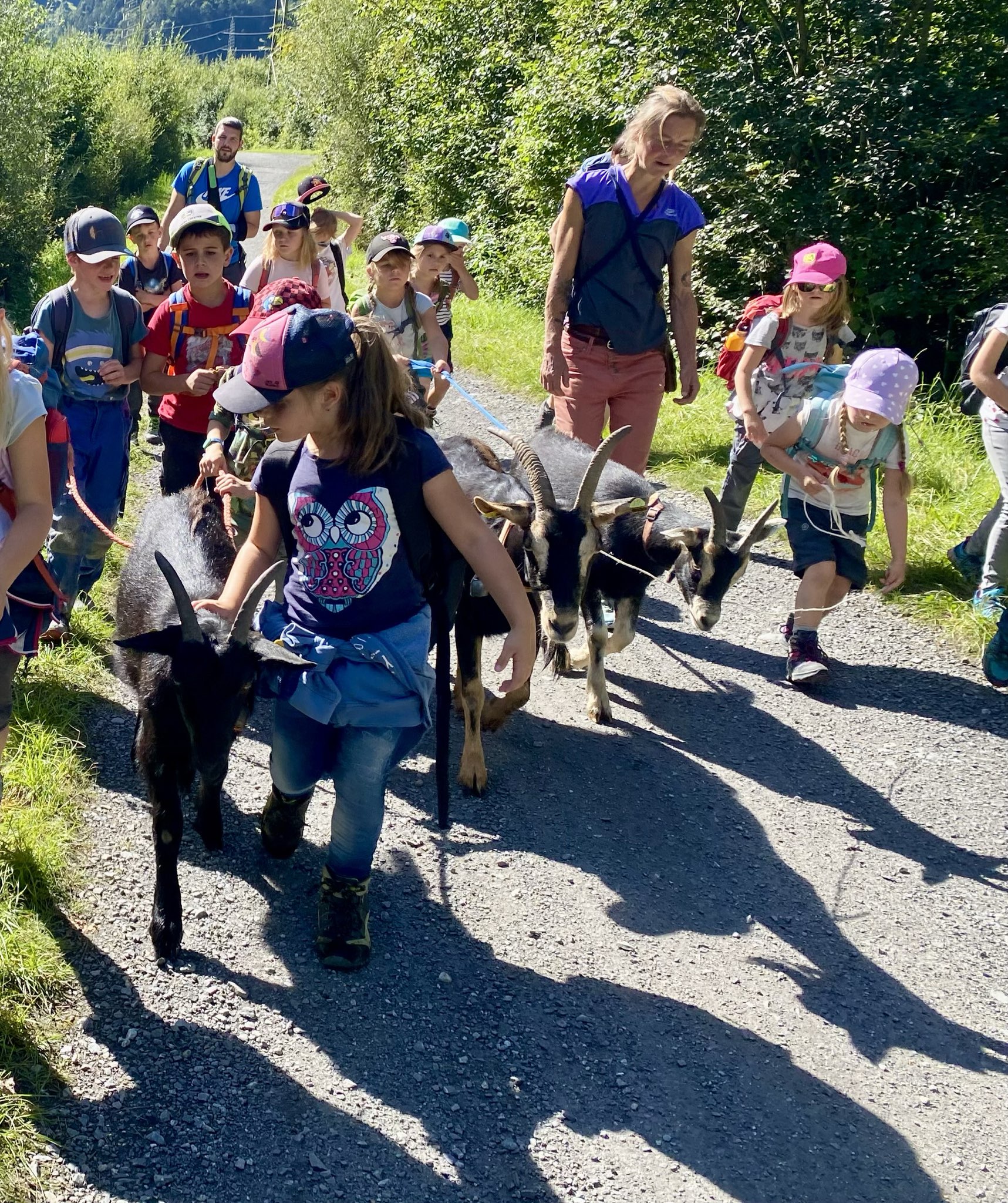 Mit dem Bus fuhren wir zuerst nach Amsteg. Dort warteten beim Bähndli Amsteg-Arnisee bereits 4 hungrige Ziegen und ihre Besitzerin Nadine Bless auf uns. Die Ziegen waren sehr zutraulich und liefen mit uns frei der Reuss entlang Richtung Selderboden (Silenen). Auf der Strecke durften wir die Ziegen Elma, Rocky, Carina und Blacky mit Blättern und Blumen füttern und sie für eine kurze Zeit sogar an Leinen führen. Nach dem Zmittag auf dem Selberboden mussten wir uns auch schon wieder von den Ziegen und Nadine verabschieden. Die restliche Zeit vor der Rückfahrt verbrachten wir auf dem Spielplatz.